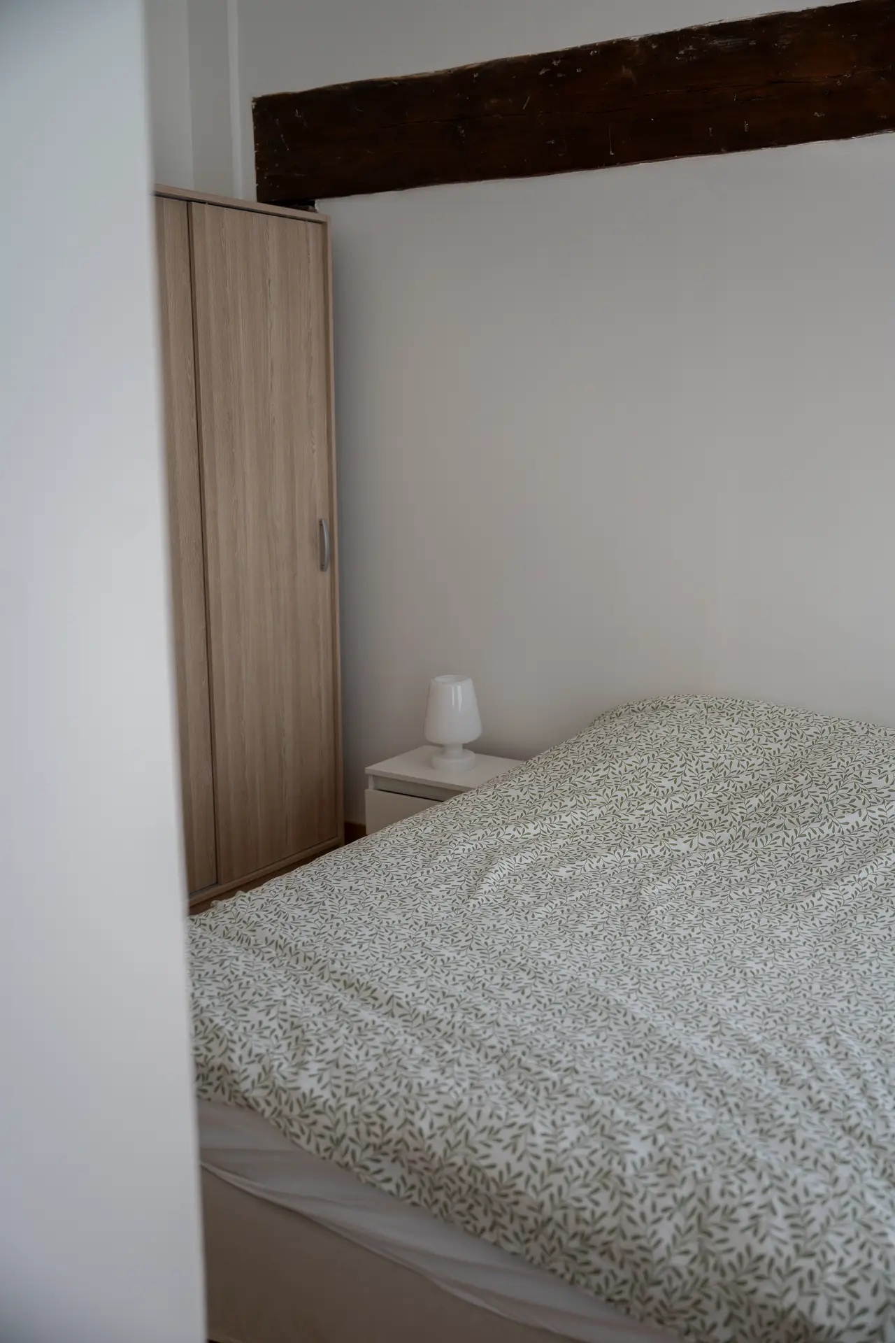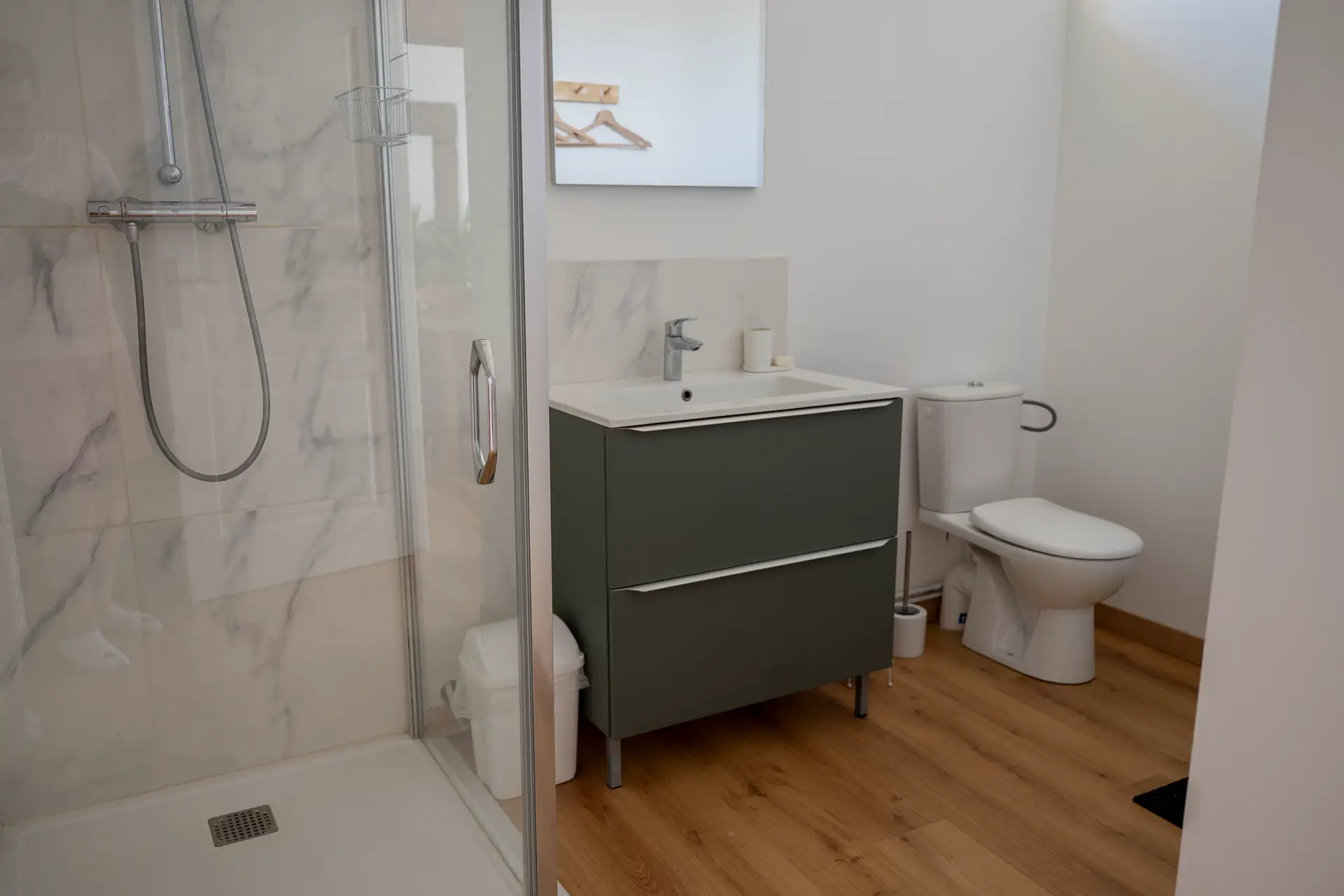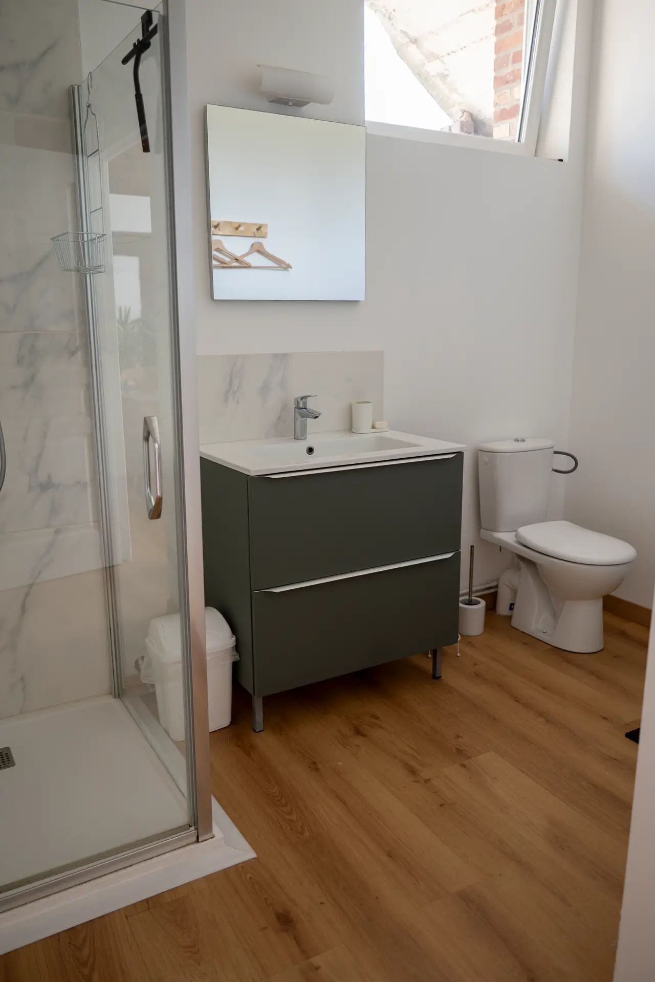 La salle de bain moderne dispose d’une douche spacieuse et de tout le nécessaire pour votre confort.Côté extérieur, profitez d’une terrasse privative avec vue sur la propriété, idéale pour vos repas en plein air ou vos moments de détente. Le stationnement est facile et gratuit devant le gîte.